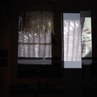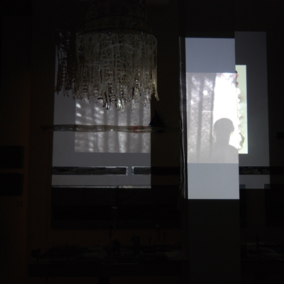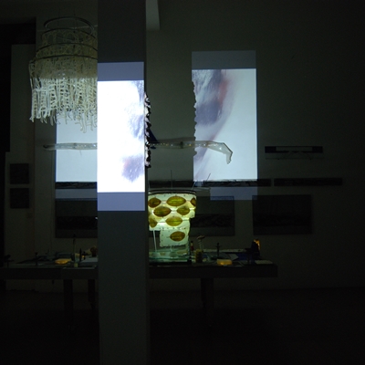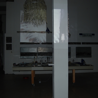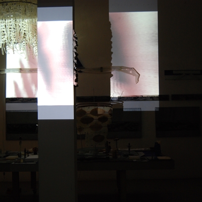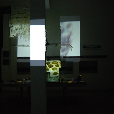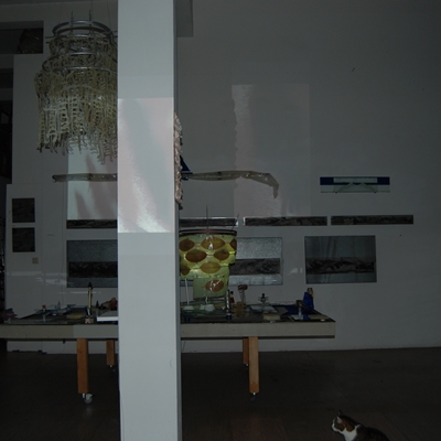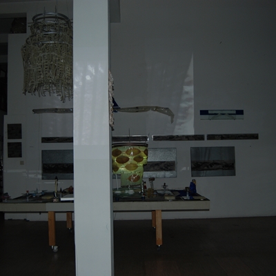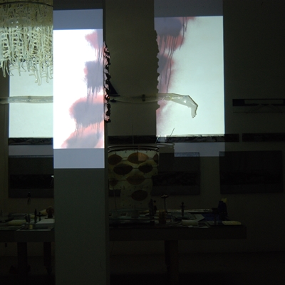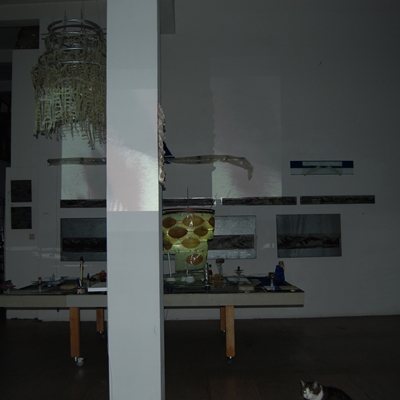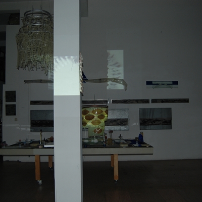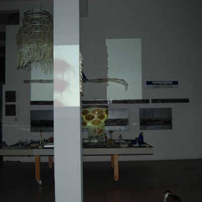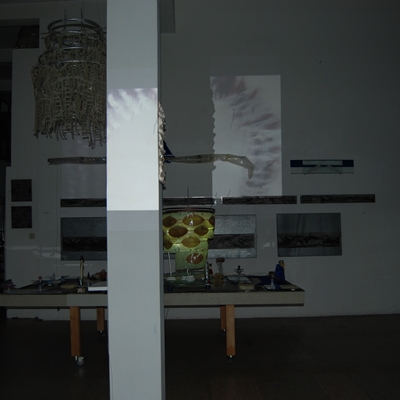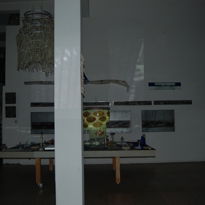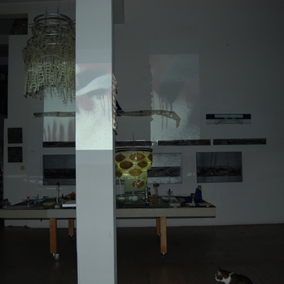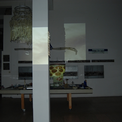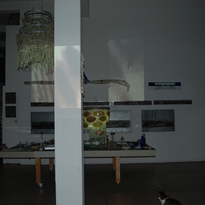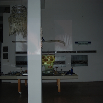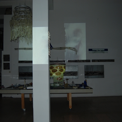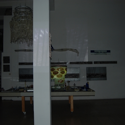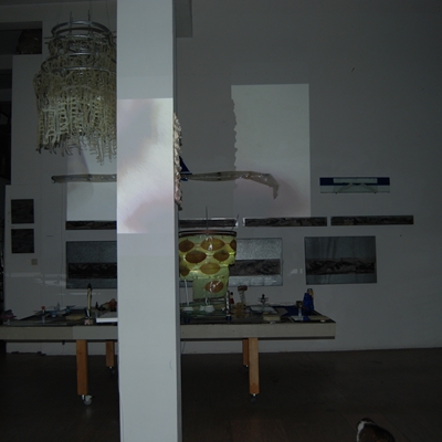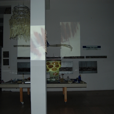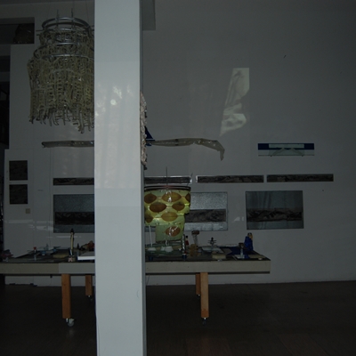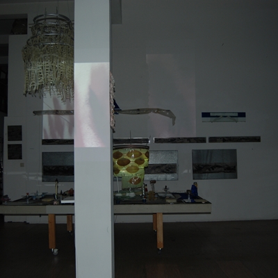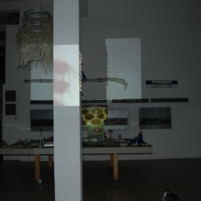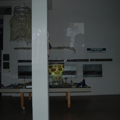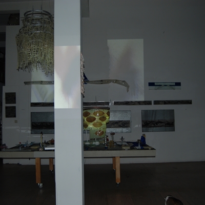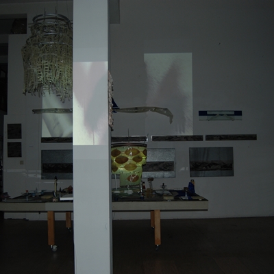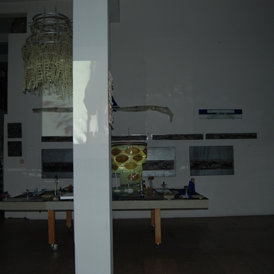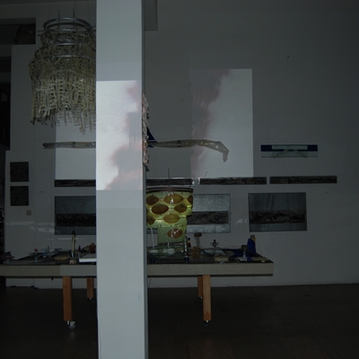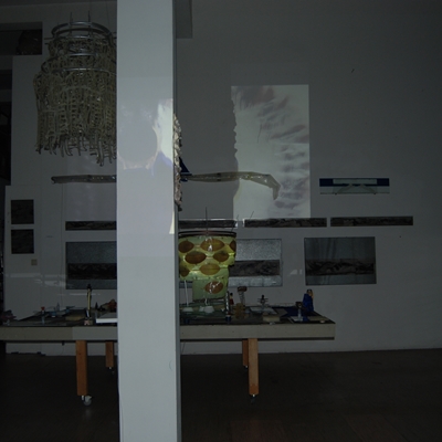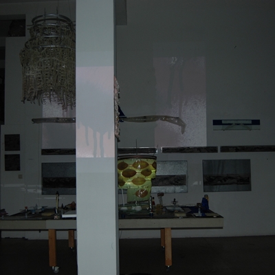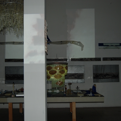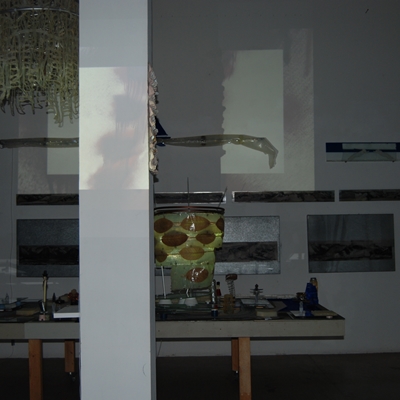 Eine Gemeinschaftsarbeit von Winfried Habel, Bettina Elmpt, Timo Elmpt-Habel : Winfried Habel: Wandarbeiten, Silikonskulpturen, Bettina Elmpt: "Tänzer", Kleinskulpturen aus industriell vorgefertigten Materialien, Timo Elmpt-Habel: Videoprojektion